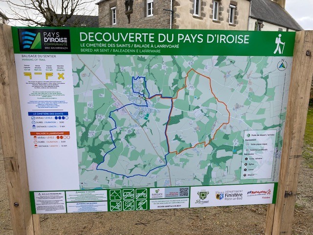 Un premier panneau, installé récemment, présente deux parcours issus du topoguide « Le Pays d’Iroise… à pied » : le circuit des Saints (11 km), une balade riche en découvertes patrimoniales, et la balade à Lanrivoaré (10 km), idéale pour explorer les paysages locaux.