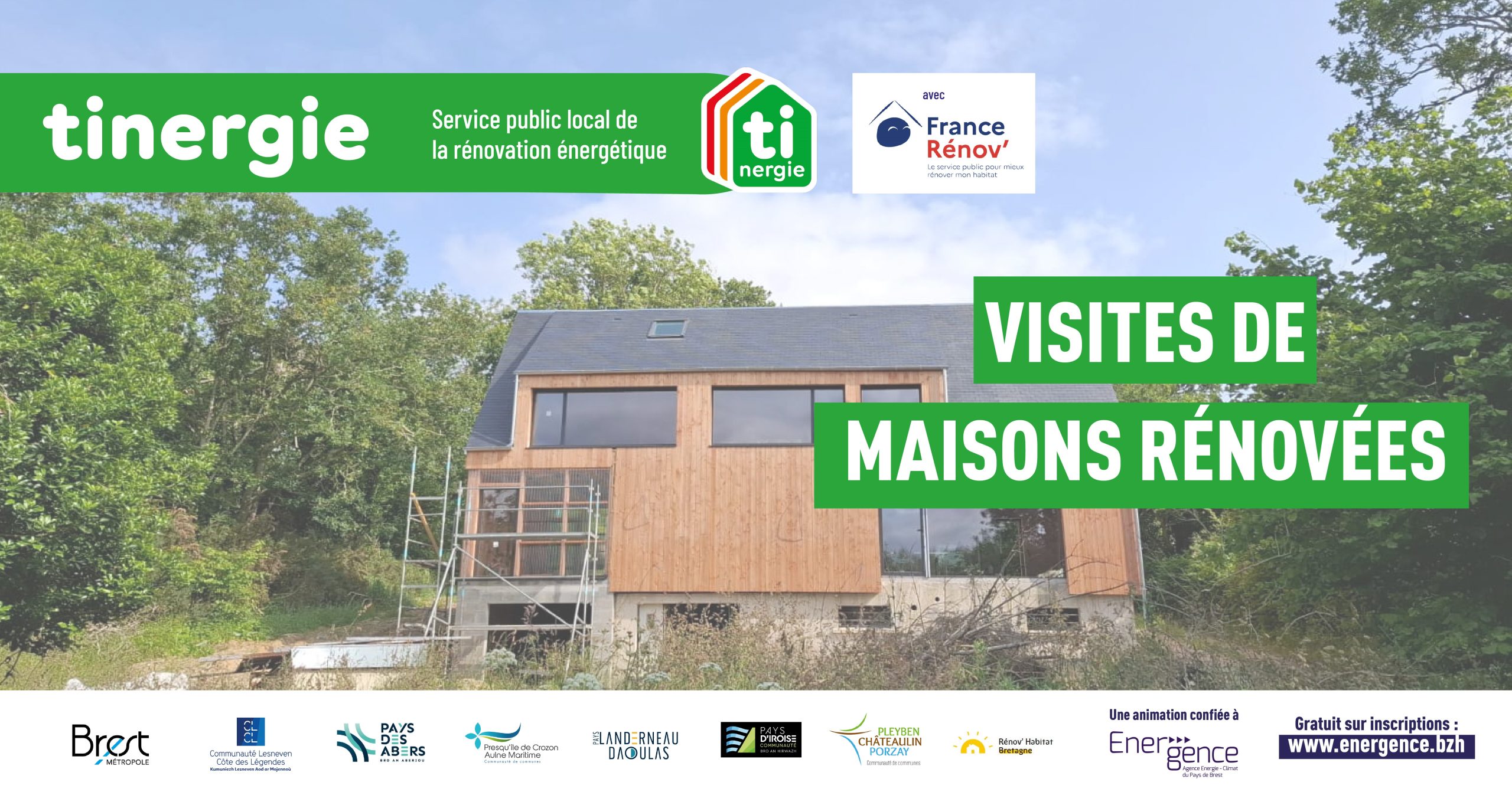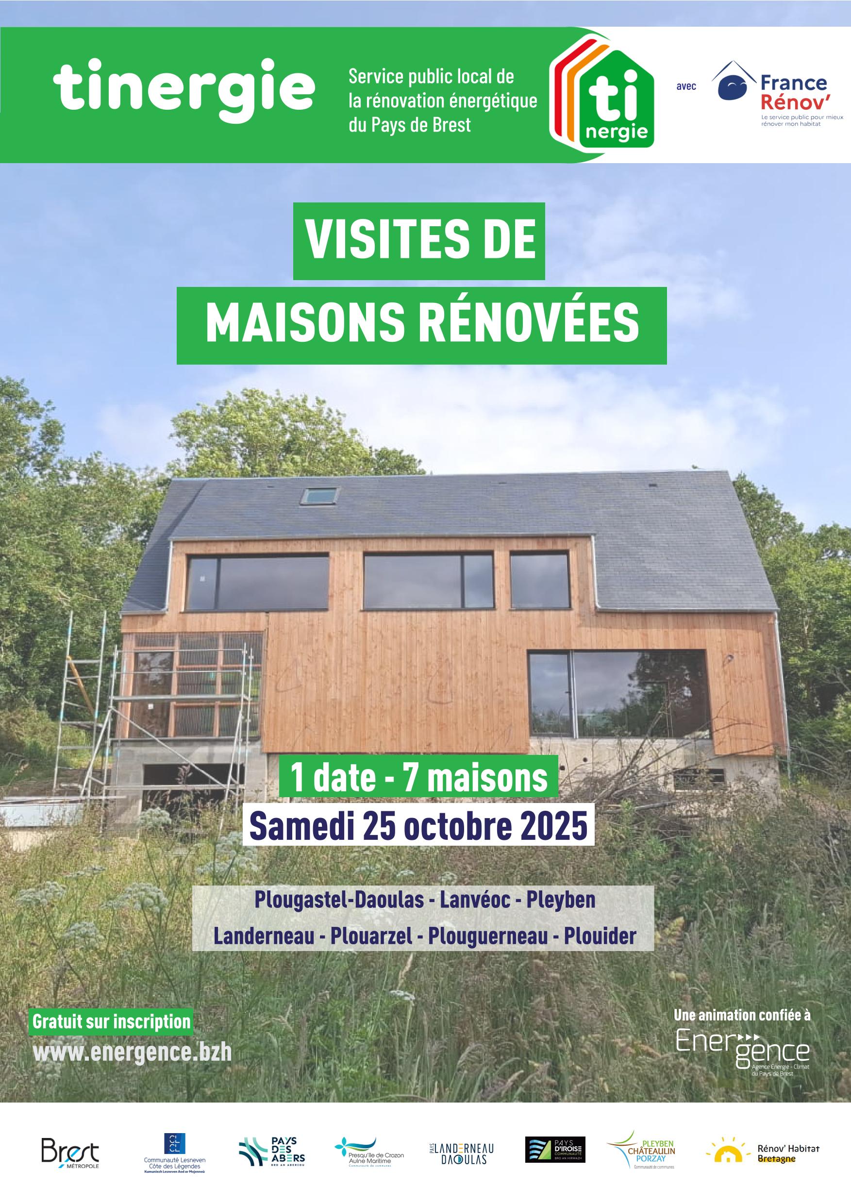 Dans le cadre du dispositif Tinergie*, le samedi 25 octobre 2025, des visites de maisons rénovées seront organisées sur les territoires des communautés de communes du Pays d’Iroise, du Pays des Abers, de Lesneven côte des Légendes, de la Presqu’île de Crozon Aulne Maritime et de Pleyben Châteaulin Porzay.
