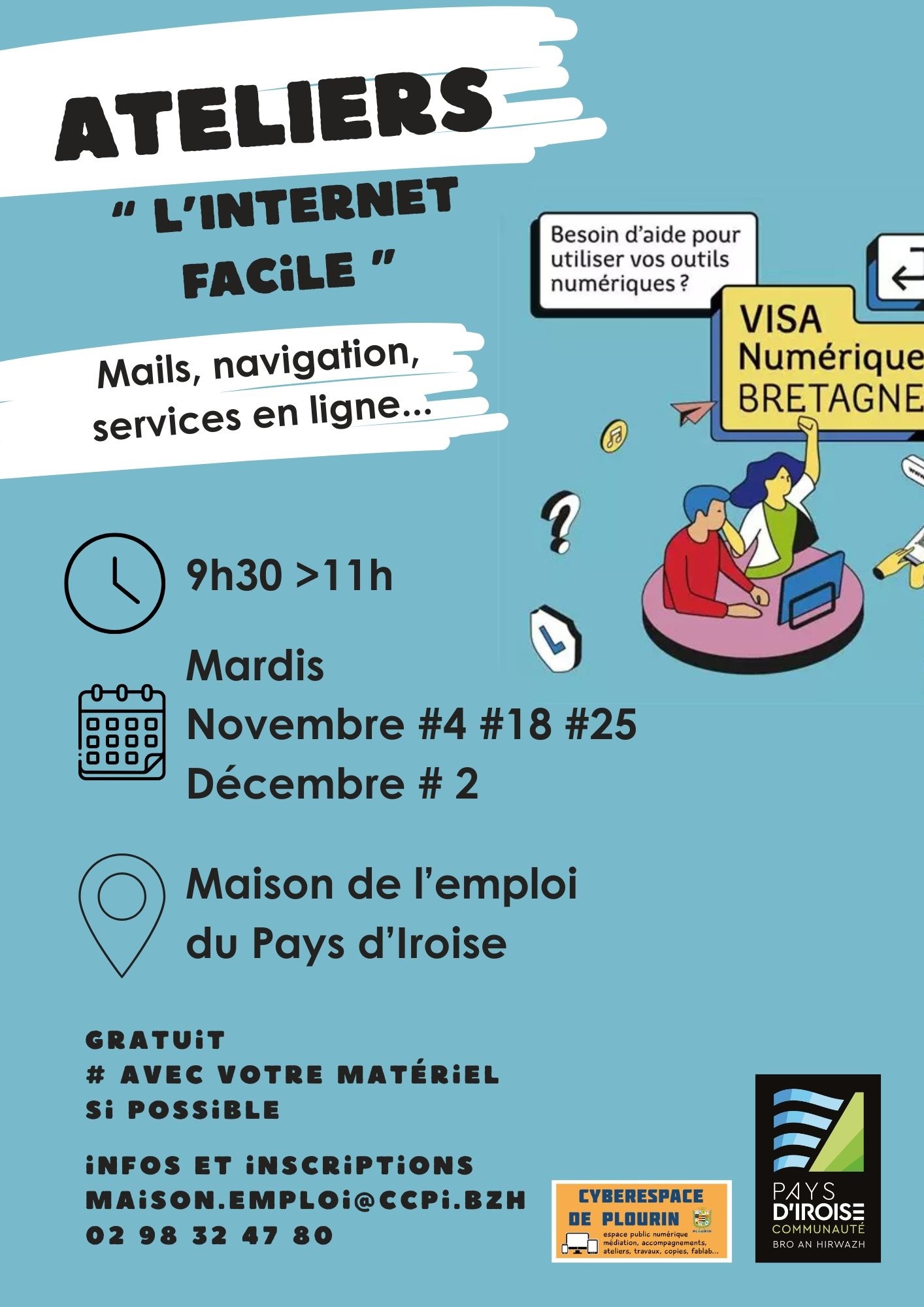 La Maison de l’emploi du Pays d’Iroise vous propose de participer à des ateliers numériques, animés par le Cyberespace de Plourin. Ces ateliers se dérouleront à Pays d’Iroise Communauté, les mardis, de 9h30 à 11h (les 4, 18, 25 novembre et le 2 décembre). Sur inscription au 02 98 32 47 80 ou par mail à maison.emploi@ccpi.bzh. Le premier atelier aura lieu le mardi 4 novembre, de 9h30 à 11h, à Pays d’Iroise Communauté.