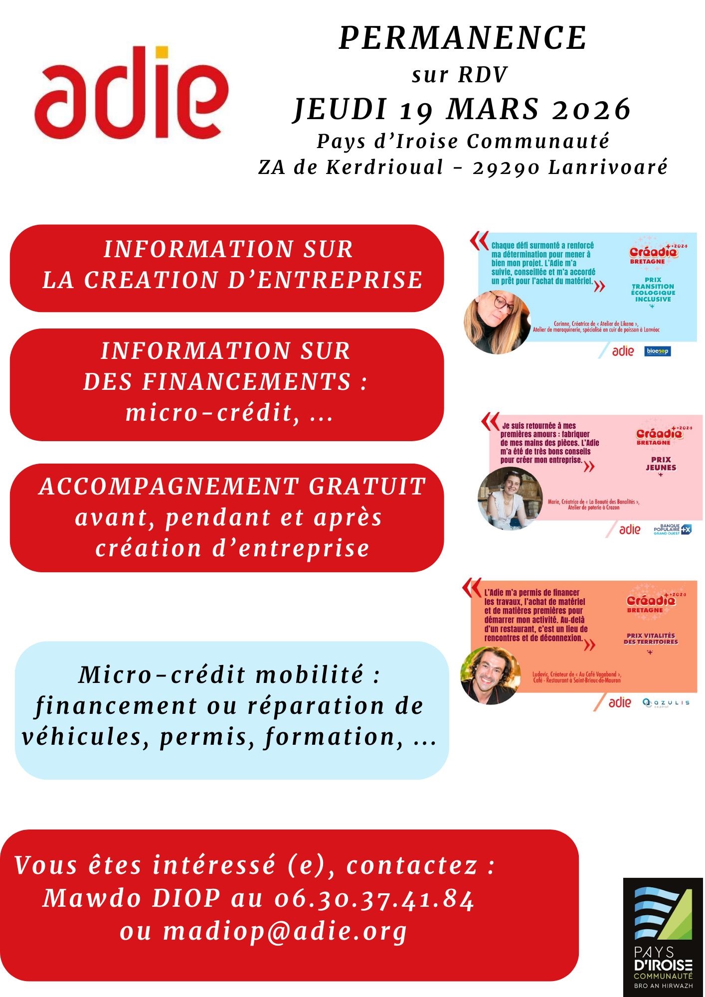 L’ ADIE (Association pour le Droit à l’Initiative Économique), en partenariat avec la Maison de l’emploi du Pays d’Iroise, organise une permanence d’information sur la création d’entreprise et les financements (micro-crédit,…), le jeudi 19 mars 2026 (sur RDV) à Pays d’Iroise Communauté.