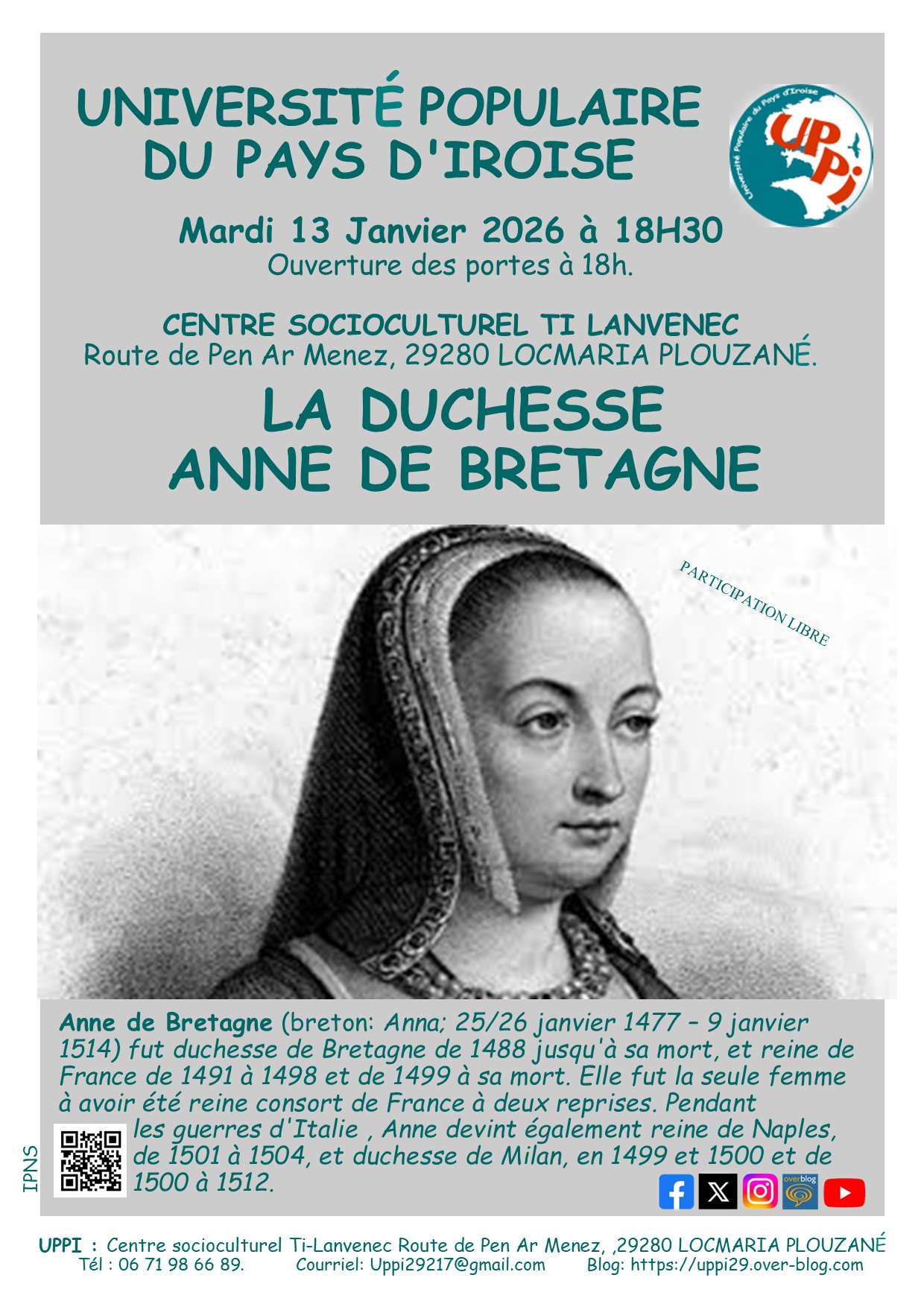 Anne de Bretagne, née à Nantes le 25 janvier 1477 et décédée à Blois le 9 janvier 1514, est la fille du duc François II. À la mort de ce dernier, elle hérite du duché de Bretagne. Elle devient ensuite reine de France à deux reprises : une première fois en 1491, à la suite de son mariage avec Charles VIII, puis une seconde fois en 1499, après son union avec Louis XII.