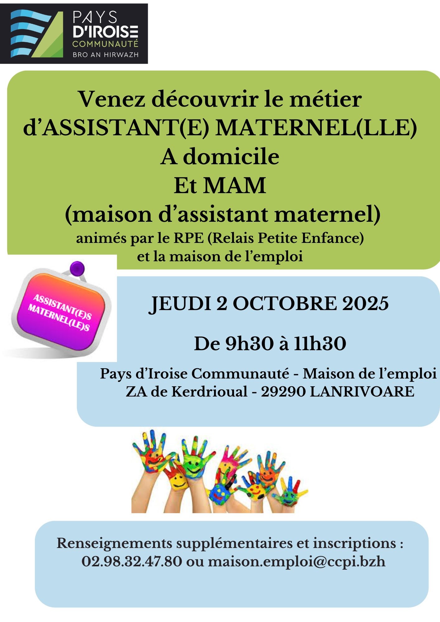 Venez découvrir le métier d’assistant(e) maternel(le) à domicile et en MAM, le jeudi 02 octobre 2025, de 9h30 à 11h30 à la Maison de l’emploi, à Pays d’Iroise Communauté.