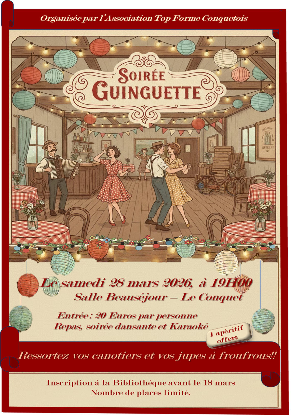 Soirée guinguette organisée par le club Top Forme Conquetois. 1 apéritif offert, plat chaud servi à l’assiette, dessert gourmand, café prix unique : 20 €.