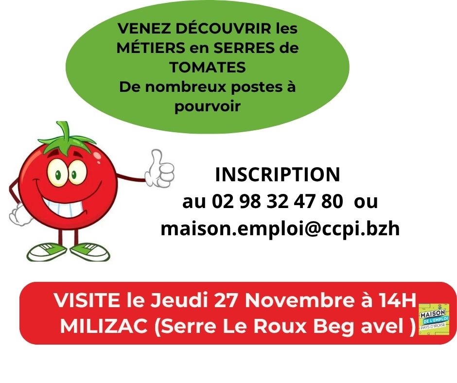 La Maison de l’emploi du Pays d’Iroise vous propose de venir découvrir les métiers en serres de tomates le jeudi 27 novembre à 14h, à Milizac (Serre Le Roux Beg Avel).